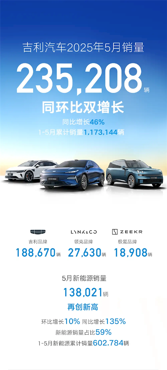 据悉,吉利汽车5月的销量达到了235208辆,与去年同期相比,实现了46%的大幅增长。