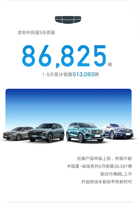 从品牌方面来看,吉利品牌5月销售188670辆,其中中国星销售86825辆,1-5月累计销量513093辆。