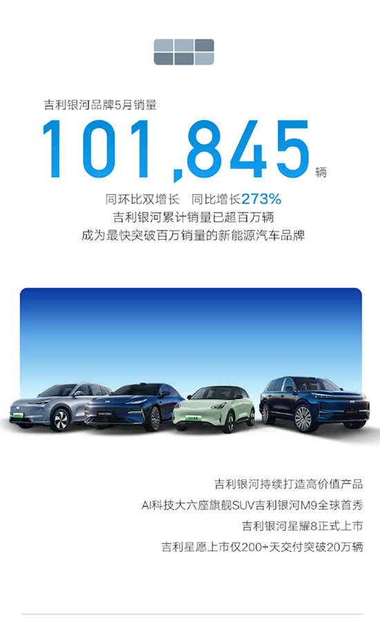 吉利银河5月销售101845辆,同比增长273%,这一惊人的增长速度充分展现了吉利银河在市场中的强大吸引力和竞争力。