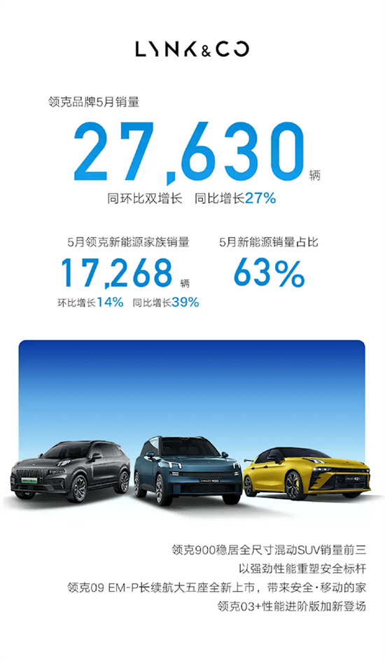 领克品牌5月销售27630辆,同比增长27%,领克新能源家族销量17268辆,环比增长14%,同比增长39%,新能源销量占比63%。