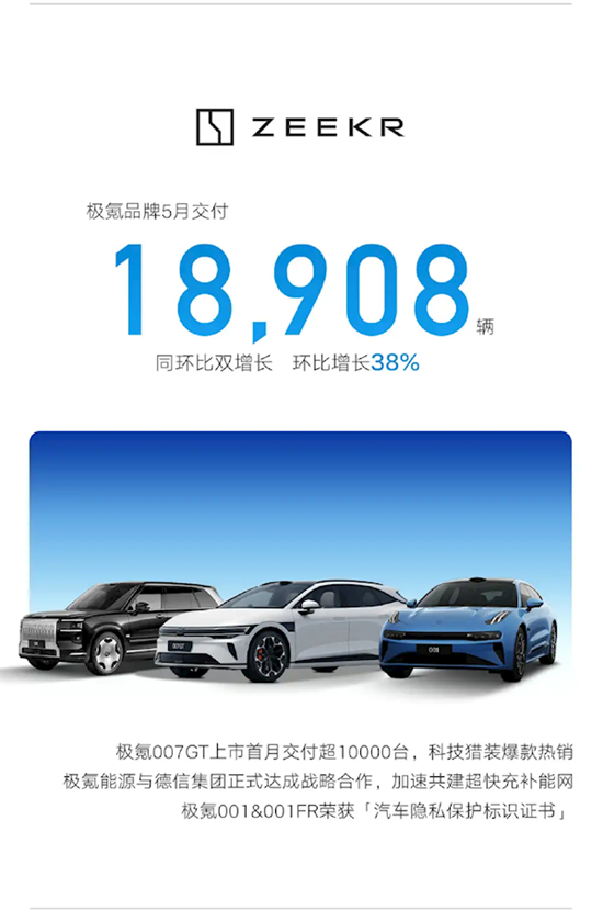 极氪品牌5月销售18908辆,环比增长38%,这一增长数据也显示出极氪品牌在市场中的良好发展态势。