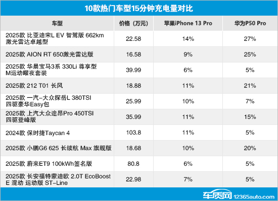 在针对华为P50 Pro的测试中,比亚迪宋L EV、AION RT、212 T01以及小鹏G6表现相对出色,15分钟内的充电量均达到或超过20%。上汽大众途昂Pro同样支持华为快充协议,在15分钟内的充电量也超过了10%。相比之下,华晨宝马3系、保时捷Taycan、蔚来ET9和长安福特蒙迪欧运动版的测试成绩并列倒数第一,充电量仅为5%。