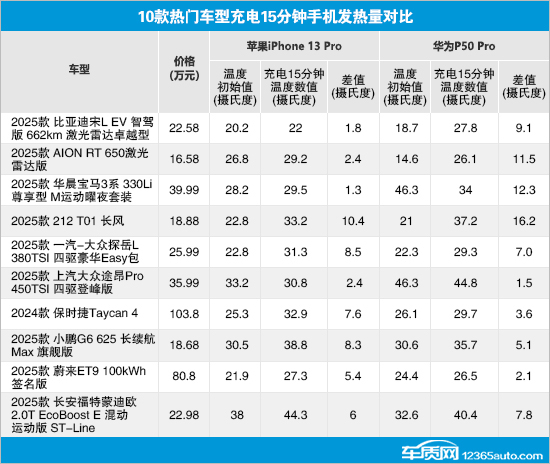 而为华为P50 Pro充电时,AION RT和212 T01的温度差值相对较高,均超过10摄氏度。相比之下,蔚来ET9对于手机充电温度把控的表现更加出色,充电前后差值仅为2.1摄氏度。此外,华晨宝马3系和上汽大众途昂Pro充电后的手机温度均低于充电前,前者的温差甚至达到了12.3摄氏度。