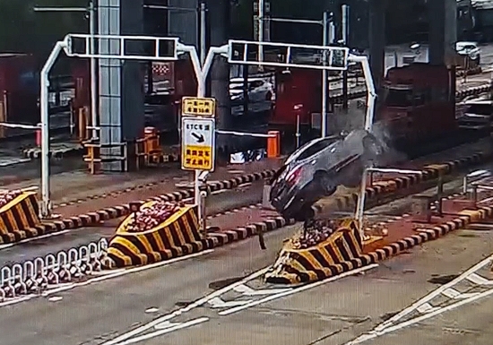 6月30日下午16:10分许,,陕西榆林,白某驾车经由榆林南收费站下高速时,直接撞上收费站安全岛,车头向上冲起随即四轮朝天仰翻在地,幸运的是白某系了安全带,仅受轻伤。