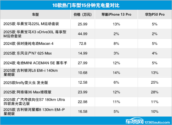 在针对华为P50 Pro的测试中,阿维塔06增程版和firefly萤火虫表现相对出色,15分钟内的充电量均超过20%。吉利银河L6 EM-i、广汽传祺向往S7和吉利银河星耀8同样支持华为快充协议,在15分钟内的充电量也达到或超过了10%。相比之下,华晨宝马X3的测试成绩再次位列倒数第一,充电量仅为2%。