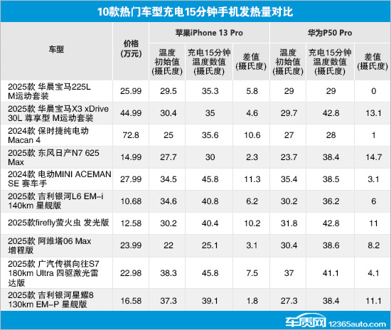 而为华为P50 Pro充电时,东风日产N7、华晨宝马X3、吉利银河星耀8和firefly萤火虫的温度差值相对较高,均超过10摄氏度。相比之下,华晨宝马2系与保时捷纯电动Macan对于手机充电温度把控的表现更加出色,其中,华晨宝马2系手机充电前后甚至没有产生温度变化。