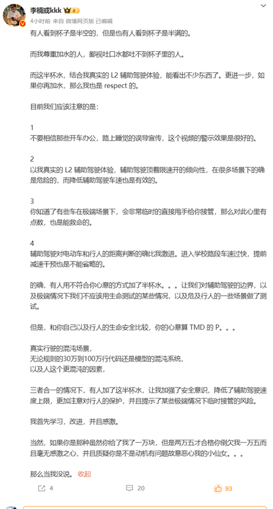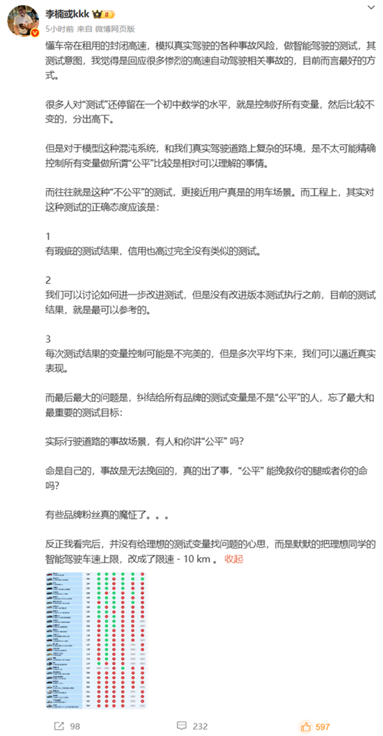 怒喵科技创始人李楠发文,分享了他对懂车帝测试及辅助驾驶的看法。