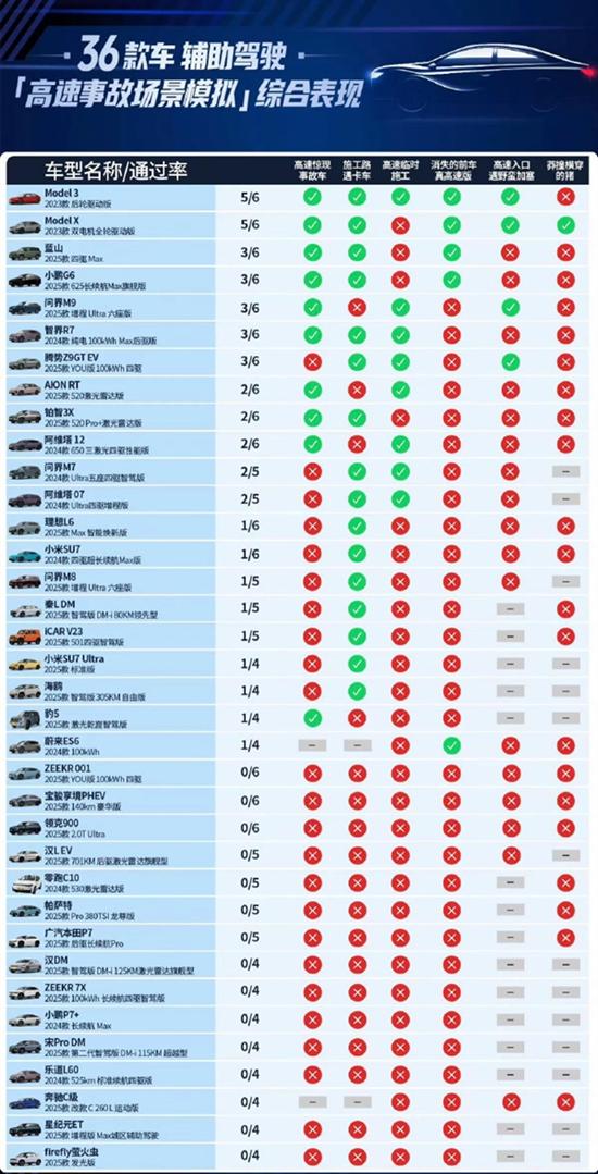 根据懂车帝测试结果显示,在6类高速场景测试中,共36款车型参与,累计完成183次测试,44次测试被评为“通过”,整体通过率24%。