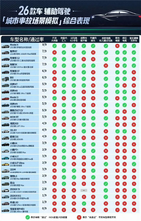 在9类城市道路场景中,26款车型参与测试,总测试次数233次,通过103次,通过率约44.2%。