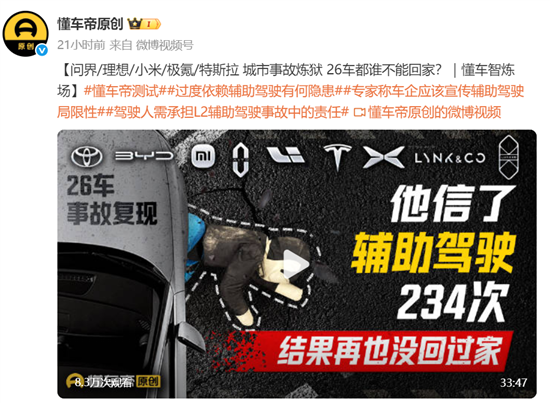近日,懂车帝辅助驾驶测试节目《懂车智炼场》选取市场热门畅销的20多个品牌的近40款车型,包含问界、智界、小米、小鹏、蔚来、比亚迪、理想、阿维塔、特斯拉等,模拟城区和高速两大道路环境的15个真实事故场景,进行辅助驾驶科普。