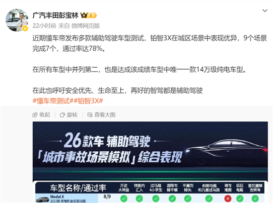 其中,广汽丰田副总经理彭宝林表示:近期懂车帝发布多款辅助驾驶车型测试,铂智3X在城区场景中表现优异,9个场景完成7个,通过率达78%。在所有车型中并列第二,也是达成该成绩车型中唯一一款14万级纯电车型。“在此也呼吁安全优先、生命至上,再好的智驾都是辅助驾驶。”