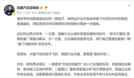“对此,我有两点倡议:一是要将‘失效兜底能力’纳入行业强制标准,如碰撞自动解锁、夜间施工区误判率等;二是要以‘最差场景通过率’取代营销话术,倒逼企业筑牢安全底线。岚图愿意践行国家队责任,开放全系车型用于各行业机构实测验证。”邵明峰写道。