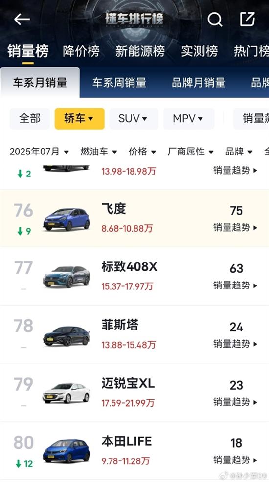 然而,市场销量数据却给这句豪言壮语泼了一盆冷水。2025年7月的轿车销量榜单显示,飞度的月销量仅为75辆,排名第76位,与曾经月销破万的辉煌成绩相比,可谓天壤之别。