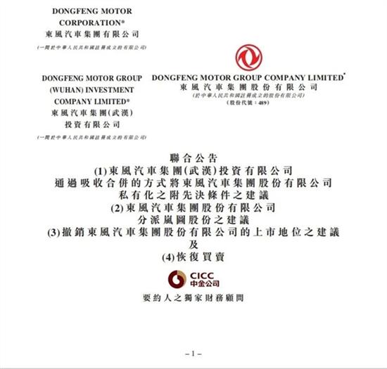 东风集团股份发布公告,宣布将通过其子公司东风汽车集团(武汉)投资有限公司进行“吸收合并”实现私有化退市。