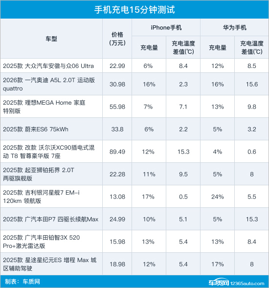 此次参与测试对比的10款车型中,吉利银河星舰7 EM-i的综合表现处于领先地位,对于iPhone和华为手机的充电效率较高,手机发热量也控制合理,并且手机无线充电还支持触控屏+语音的关闭方式,但仅配备了1个手机无线充电板成为了唯一的遗憾。表现同样值得肯定的还有一汽奥迪A5L,作为一款传统豪华品牌的燃油车,在充电效率方面超过了众多新能源车,只是对于华为手机的充电发热量控制还有待优化。相对而言,蔚来ES6综合表现一般,针对两款手机的充电效率都不高,存在较大提升空间。