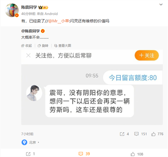 这不是陈震第一次卖劳斯莱斯了,此前陈震已经卖过一台库里南,理由是“受不了库里南不能远程开空调”。