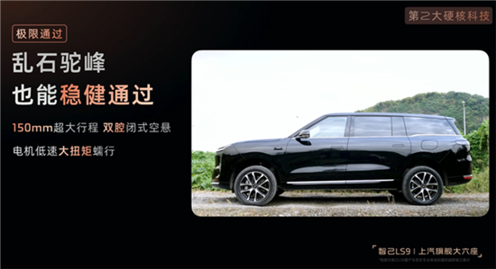 最后,LS9配备有双腔闭式空悬系统,行程高达150mm,升到最高时可拥有媲美硬派越野的通过能力,配合电机低速大扭矩的特性,甚至能轻松通过乱石驼峰桥。
