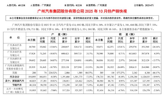 广汽集团发布2025年10月产销快报,10月汽车销量170,731辆,同比下降8.10%;本年累计销量为1,354,384辆,同比下降10.94%。