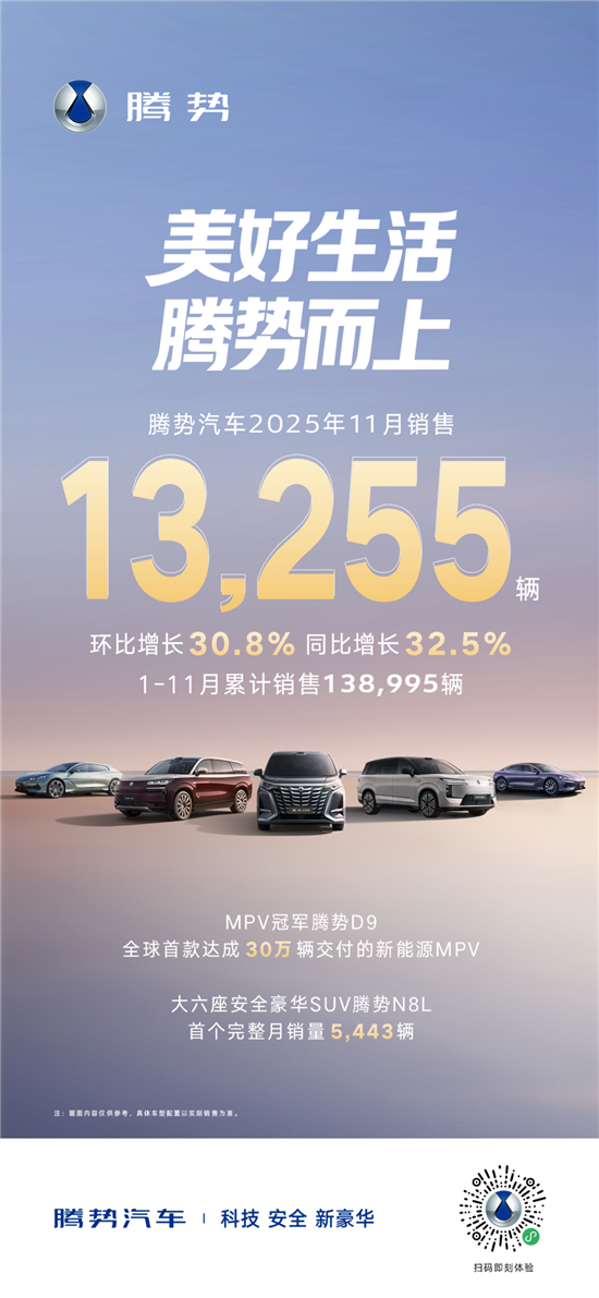 最新公布的销量数据显示,腾势汽车11月销量持续攀升,全系售车13,255辆,环比增长30.8%,同比增长32.5%。今年1至11月,腾势累计销量已达138,995辆。尤为值得关注的是,MPV车型腾势D9达成了累计交付30万辆的里程碑,成为全球首款实现这一规模的新能源MPV车型。这不仅标志着腾势D9在细分市场的绝对领先地位,也印证了中国品牌在高端新能源MPV领域,已具备全球竞争力。