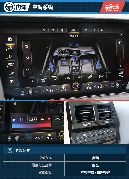 大众途锐配备了四区自动空调系统,经过小编实际测试,该车制冷速度及效果非常明显,前排空调完全在中控屏幕内操作,触控反应较为灵敏,与此同时屏幕内还可显示出空调出风示意图。另外该车还搭载了空气净化系统,减少PM2.5对车内人员的侵害。后排空调控制由按键构成,在阻尼以及灵敏度方面均达到了应有的水准。