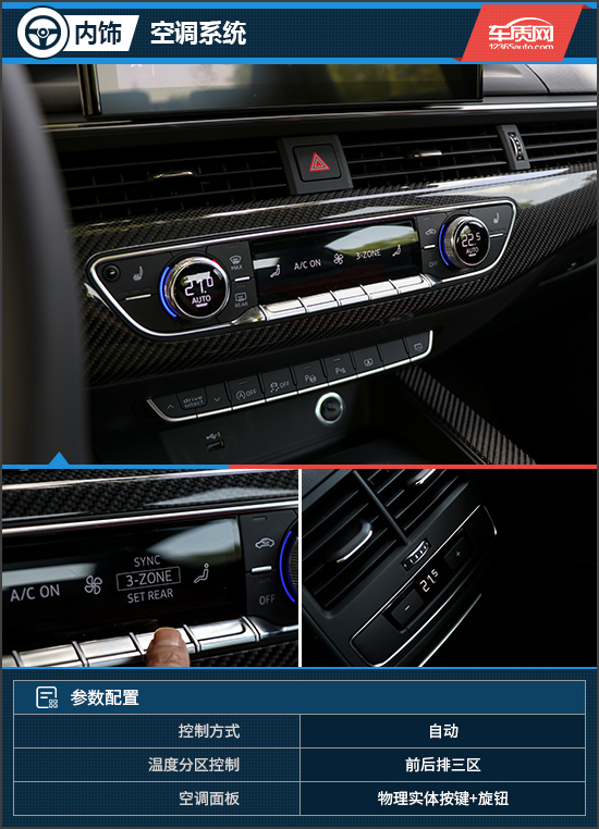 配置方面,由于此次试驾的新款A4L为顶配运动版车型,所以提供了非常全面的舒适性功能,比如可开启全景天窗、三区自动空调、自动大灯、雨量感应式雨刷以及前排座椅电动调节等。其中,自动大灯还支持自适应远景光调节以及前大灯雨雾模式,将两个功能开启之后可以真正实现全天候自适应照明功能。此外,试驾车上的主驾驶座椅两组记忆功能为选装配置,选装价格2500元。