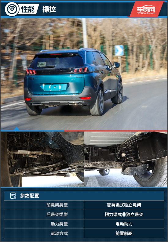操控部分,别看东风标致5008是一台中型SUV,但是其方向盘指向性颇为精准,而且尾部循迹性也相当出色,轻微激烈驾驶,车身姿态并不会显得特别狼狈。当然,相比之下,舒适安逸的驾驶风格肯定要更适合它。我知道有很多人会担心扭力梁式非独立悬架的舒适性,实际感受下来,我个人的体验感还是不错的,而且同事们的反馈也大多是积极且正向的,综合来看还是比较有说服力。经过坑洼时,悬架能够很好地控制住纵向的多余跳动,虽然在连续转向或是单侧后轮面对起伏时,后悬架整体还是会出现一定的横摆,不过幅度并不大,而且基本上很快就能稳定住,对于操控和舒适性的影响都很小。
