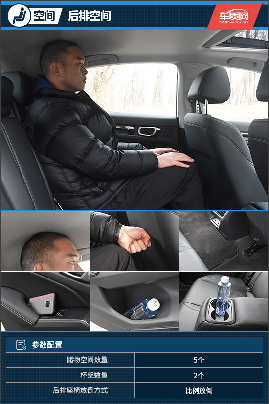 保持前排座椅位置不变,体验者来到后排。头部会扫到顶棚,长途乘坐会感觉比较压抑,好在腿部空间还算不错,大概有一拳的余量。后排地板中间位置有凸起,而且高度和宽度都不算小,因此对于中间座位的乘客并不友好。储物方面,后排门板储物槽容积“缩水”,实用性表现一般。后排扶手配有贯穿式杯架,除了放置水瓶之外,也能够当做储物槽使用。