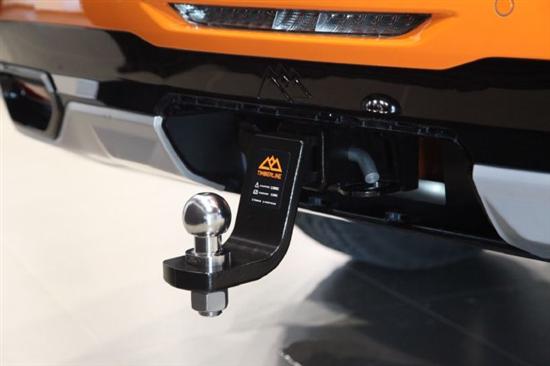 昆仑巅峰版车型的后杠可以说是别有洞天,在中间的位置是有一个可打开的盖板,这下面隐藏着一个方形的原厂拖车接口,可以外接不同的拖车钩。昆仑巅峰版车型是出厂自带2.1吨拖拽资质的,这可要比那些私自加装的拖车钩安全太多了。