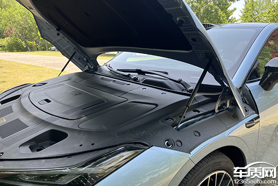前机舱盖的开启开关位置位于驾驶位前部左下方,开启时需要拉动车内开关两下,然后直接抬起前机舱盖即可。经实测,评测车的前机舱盖采用双侧液压支撑杆,稳定性较好。