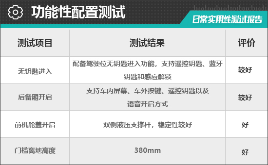 对于消费者来说,门槛离地高度一定程度上决定了上下车便利性。根据实测结果来看,评测车的门槛离地高度为380mm,驾乘人员日常上下车十分方便。