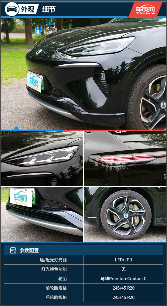 评测车配备德国马牌PremiumContact C系列轮胎,采用新型含硅高分子化合物胎面配方,有效减少轮胎转动中的能量损失,降低滚阻,轮胎规格为245/45 R20。