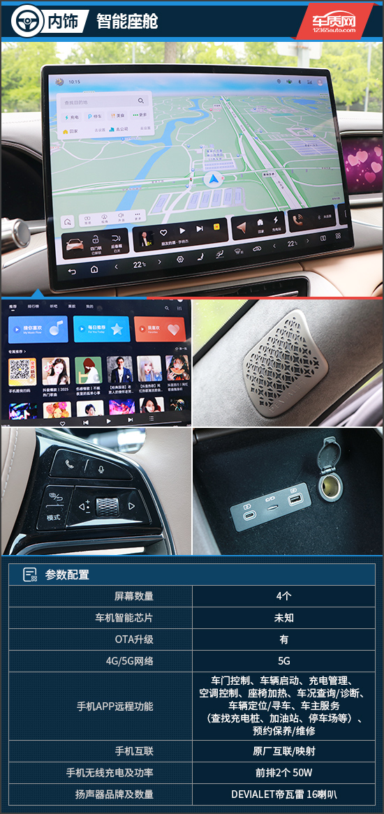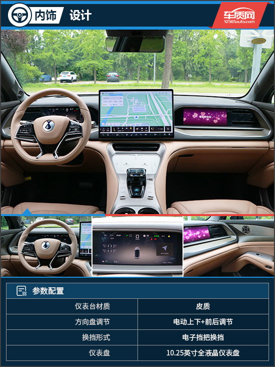 内饰设计以豪华感、科技感与人性化为核心,通过多屏联动与AI交互技术,打造了覆盖全车乘员的沉浸式科技体验。17.3英寸中控屏、10.25英寸副驾娱乐屏以及7英寸后排扶手屏,支持多任务分屏操作与独立控制。50英寸AR-HUD将导航、辅助驾驶信息投影至前挡风玻璃,减少驾驶员视线转移,提升驾驶安全性。细节方面,中控台采用超纤麂皮、哑光金属饰板和木纹装饰拼接而成,营造出浓郁的豪华氛围。