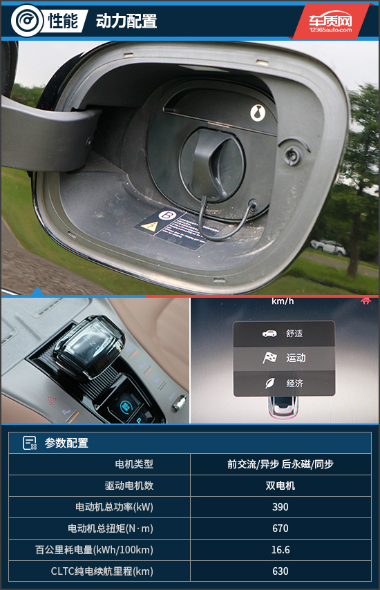 评测车搭载双电机四驱系统,电动机总功率390kW,电动机总扭矩670N·m。电池方面,匹配比亚迪自研的磷酸铁锂刀片电池,CLTC纯电续航里程630km。充电方面,由于采用全栈800V碳化硅高压平台,双枪充电功率最大可达230kW,15分钟最高补电里程350km。