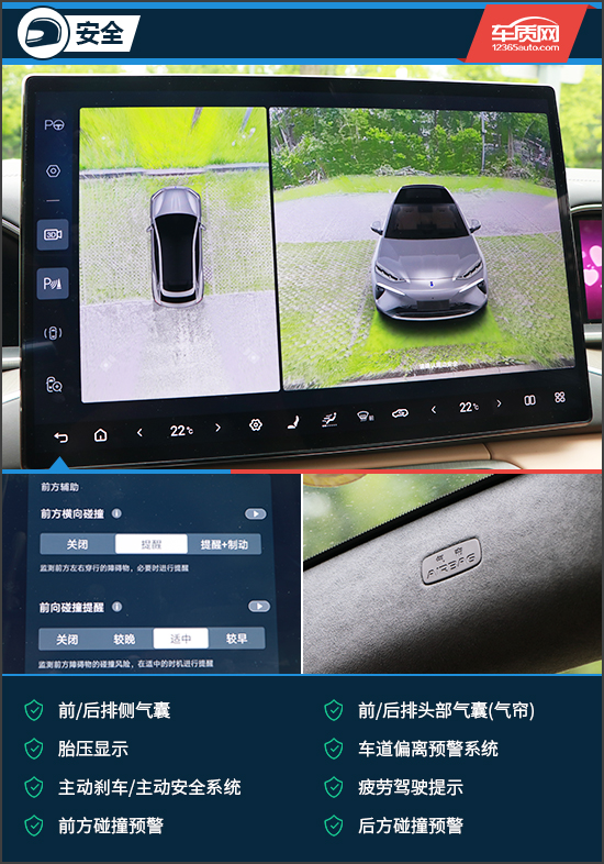 评测车搭载较为完善的主被动安全配置,包括车道偏离预警系统、主动刹车/主动安全系统、疲劳驾驶提示、DOW开门预警、前方碰撞预警、后方碰撞预警、前/后排侧气囊、前/后排头部气囊(气帘)等,提供全方位的防护。
