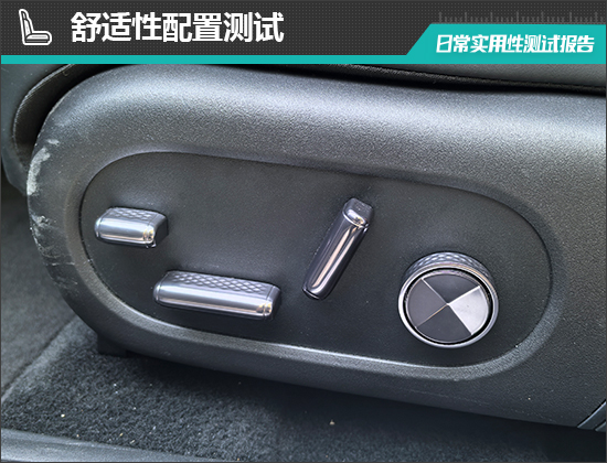 舒适性配置方面,评测车的前排座椅调节按键分别位于主/副驾座椅左右两侧,位置合理且操作便捷。功能方面,评测车的前排座椅提供加热、通风、按摩和记忆功能,主驾驶座椅还配备了头枕扬声器,第二排座椅提供加热功能,舒适性表现令人满意。