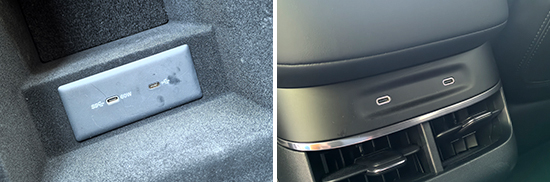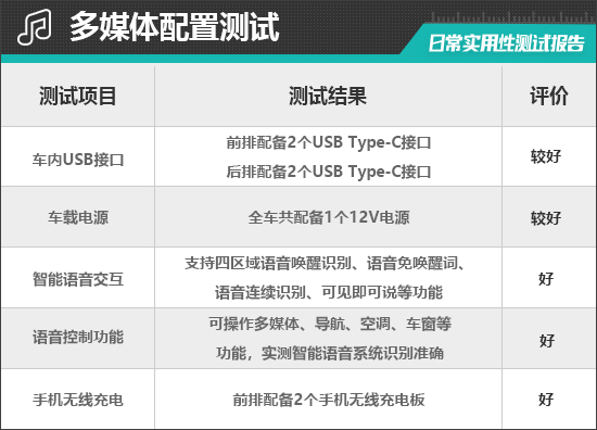在车内USB接口方面,评测车前排配备2个Type-C接口,位于中央扶手箱内;后排同样配备2个Type-C接口,位于空调出风口上方。虽然USB接口数量较多,但兼容性一般。此外,全车仅提供了1个12V电源接口,位于后备厢右侧。