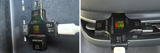 同时,我们对USB接口的电压、电流和功率进行了测试。前排Type-C接口的测试成绩分别为5V、1.45A、7.212W左右;后排Type-C接口的测试成绩分别为9.176V、0.772A、7.093W左右。