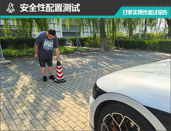在前方视野测试中,我们采用高70cm的桩桶作为参照物,随后调整车距,直至在主驾驶位可以看到桩桶上沿。经过测试,桩桶与车头最终测得的数据为2.095m,在测试过的同级别车型中处于中游水平。