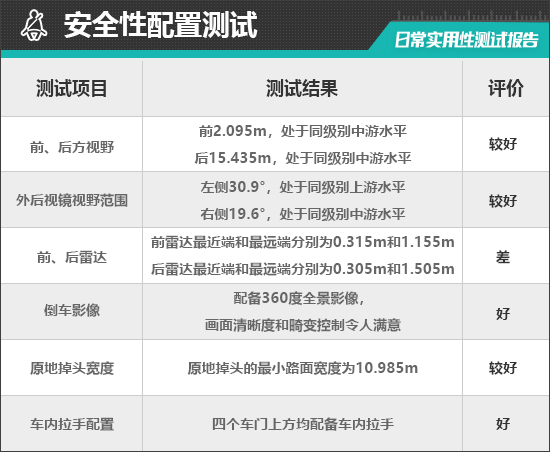 在车辆前、后方视野测试中,车内所有座椅均已调整至最低状态,所测出的数据与驾驶者正常使用时均有一些偏差,仅供参考。
