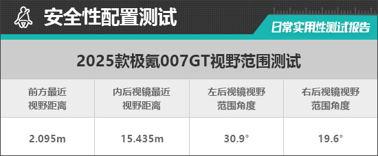 评测车的两侧外后视镜均采用普通镜片,实测左外后视镜视野范围为30.9°,处于同级别上游水平;右外后视镜视野范围为19.6°,处于同级别中游水平。