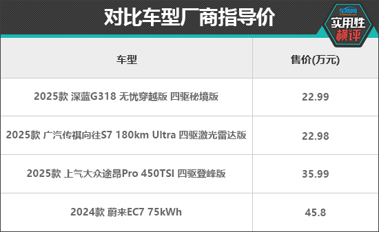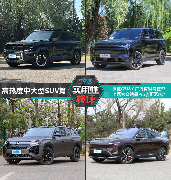 在过去很长一段时间里,国内中大型SUV市场一直都被合资品牌牢牢占据,自主品牌想要在其中分得一杯羹几乎是不可能的事儿。时过境迁,随着国内汽车工业崛起以及新能源时代的到来,国内中大型SUV市场早已发生了翻天覆地的改变,得益于自主品牌强势崛起,不同价位、不同风格的车型开始涌现,为消费者提供了十分多元化的选择。在往期的“日常实用性测试”中,我们曾测试过不少中大型SUV,本次挑选的四款对比车型分别为深蓝G318、广汽传祺向往S7、上汽大众途昂Pro以及蔚来EC7。接下来就从日常实用性测试的角度进行横评,看看哪款车型的综合表现更好。