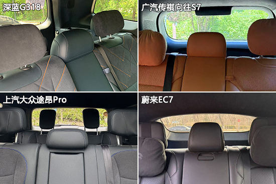车内舒适性方面,四款车型的后排(上汽大众途昂Pro为第二排)座椅均配备3个头枕,不过只有上汽大众途昂Pro和蔚来EC7的中间头枕支持上下调节,能够给予乘客头部充分的支撑。其中,蔚来EC7的后排中间头枕尺寸与两侧基本保持一致,虽然并未配备独立的软枕,但是枕靠舒适性依然比较好。