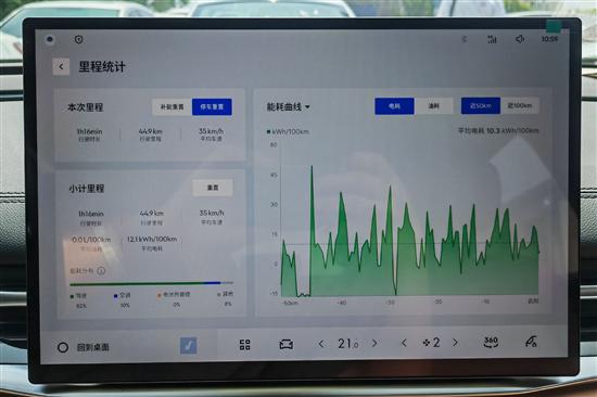 去程采用“智能”驾驶模式,因为电量充足,所以车辆全部自动采用纯电驱动。总里程约45km,其中5km非常拥堵路段、15km城区道路、25km快速路和高速路况,空调21℃、2档风量、乘坐两人。表显电耗为12.1kWh/100km,纯电续航里程从出发时的137km降到81km,下降56km。在该路况下,纯电续航可超过120km,能够满足日常通勤的需要了。