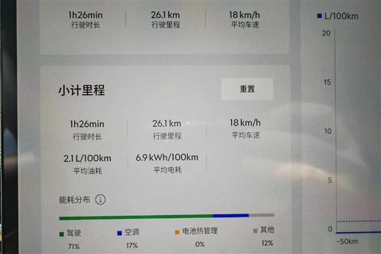返程采用的是“增程”驾驶模式用来模拟馈电工况(没开强制保电),由于电池还有很多电,所以车辆在低速行驶时仍旧以纯电驱动,只有高速和急加速时发动机才介入。总共行驶了约26km,其中拥堵路况5km,城区路况21km。表显电耗为6.9kWh/100km,油耗为2.1L/100km。虽然油耗比官方的2.67L/100km还低,但本次试驾全程电池都有电,即便用“增程”模式,发动机也很少介入,看来吉利雷神AI电混2.0系统的逻辑是有电就尽量用电。