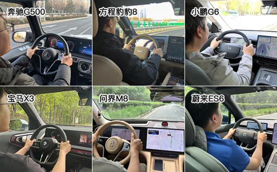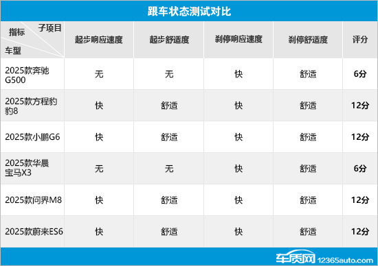 在跟车状态测试中,方程豹豹8、小鹏G6、问界M8和蔚来ES6均获得满分,表现可圈可点。相比之下,奔驰G500和宝马X3的评分仅为6分,双双垫底,原因主要是不支持自动跟车起步功能,因此在起步响应速度和舒适度两项未获得分数。