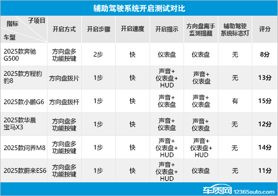 通过横向对比结果来看,除了2025款方程豹豹8(以下简称:方程豹豹8)采用方向盘拨片以及2025款小鹏G6(以下简称:小鹏G6)采用方向盘拨杆开启外,其余车型均采用方向盘多功能按键开启。虽然开启方式有所不同,但只有2025款奔驰G500(以下简称:奔驰G500)的开启步骤需要2步,日常使用略显繁琐。值得一提的是,方程豹豹8、2025款问界M8(以下简称:问界M8)以及2025款蔚来ES6(以下简称:蔚来ES6)不仅仪表盘上会有图标提示,还有声音提醒和HUD抬头显示提示,让驾驶员可以更清晰地了解到辅助驾驶状态。此外,6款车型均配备方向盘离手监测提醒功能,其中问界M8提供三种提醒方式,表现相对更好。辅助驾驶系统标志灯方面,小鹏G6是唯一配备该功能的车型,可以给其他道路参与者明显的提示,值得点赞。