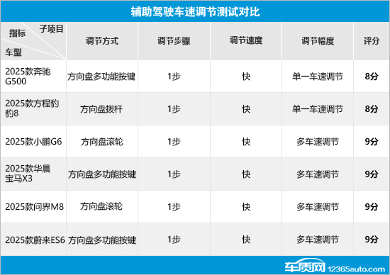 在车速调节项目中,6款车型的整体表现符合预期。虽然调节方式存在差异,但是在调节步骤和调节速度方面均表现一致。而在调节幅度方面,只有奔驰G500和方程豹豹8不支持多车速调节,导致其出现失分情况。