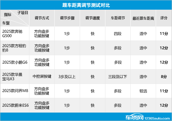 在跟车距离项目对比中,方程豹豹8、小鹏G6和蔚来ES6的表现相对较好,不仅调节方式简便,还支持多段车距调节,并且跟车距离把控也十分合理,在保证安全性的同时也可以有效避免其他社会车辆加塞。奔驰G500和问界M8在操作便利性方面同样值得肯定,但由于前者车距调节段落相对较少、后者跟车距离较远,均存在减分情况。相比之下,2025款华晨宝马X3(以下简称:宝马X3)不仅调节方式较为复杂,而且还是唯一仅支持三段及以下车距调节的车型,导致在本测试环节中成绩垫底,有待优化。