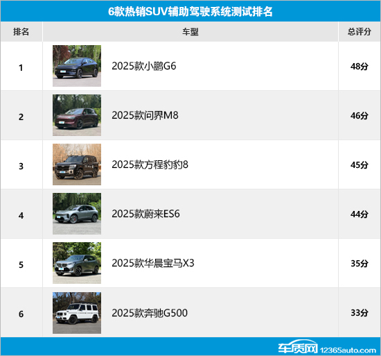 通过此次横评可以发现,只有宝马X3和奔驰G500的总评分低于40分,作为豪华品牌车型,两者在辅助驾驶方面相较同场对比的自主品牌车型确实存在一定差距。其余4款车型的总评分均超过了40分,整体表现较好。其中,小鹏G6的总评分达到了48分,排名首位。当然,参与横评的6款车型在辅助驾驶系统测试中或多或少都存在一些问题,希望厂家在后续的车型升级中持续优化改进,为车主带来更加安全便捷的辅助驾驶体验。