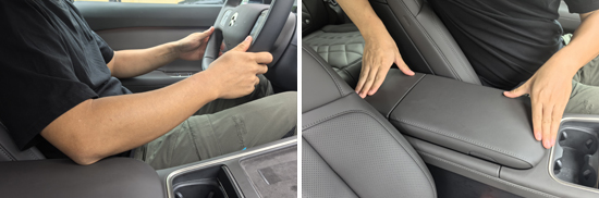 评测车前排中央扶手为侧开式设计,两侧均有按键,可实现左侧或右侧单侧开启,同时按下两侧按键还能将盖板取下,扶手采用软质材质包裹,触摸手感比较不错。略有遗憾的是,该扶手不支持位置调节,但驾驶者在驾驶过程中依然可以将肘部倚靠在上面。